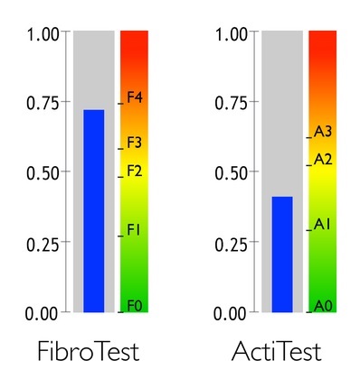 Помимо фиброза печени Фибротест показывает степень активности некровоспаления (A0-A3). Это второй по значимости результат теста неинвазивной диагностики. Активность (или градация) отражает интенсивность текущего воспалительного процесса и гибели (некроза) клеток печени (гепатоцитов). Это показатель того, насколько активно и агрессивно протекает заболевание в данный момент. Это важно для оценки скорости прогрессирования. Высокая активность (A2-A3) указывает на то, что фиброз будет прогрессировать быстрее. Это "двигатель" болезни.